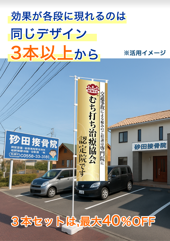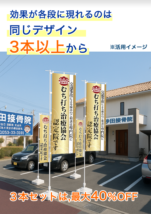 このように、のぼり旗は治療院のブランド力を引き上げ、「ここなら信頼できる」という印象を与えてくれる心強いアイテムです。