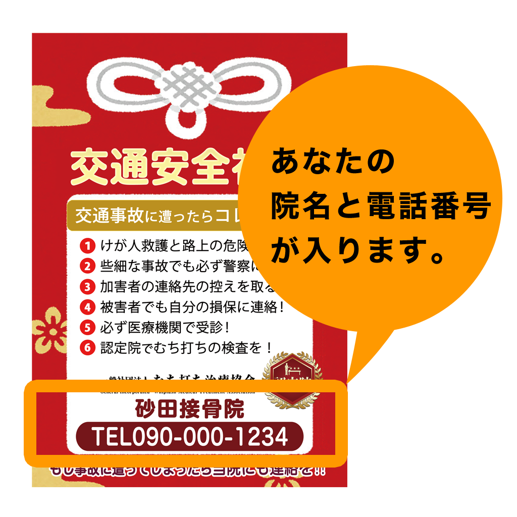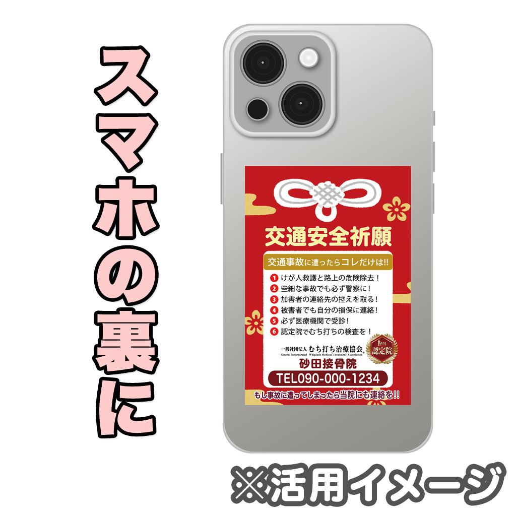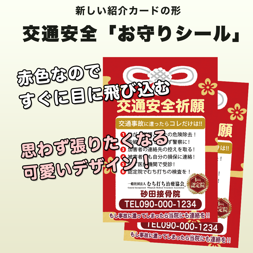 交通事故に遭ったとき、患者さまがすぐに「どこに相談すればいいか」思い出せるようにするのが、このお守りシールです。